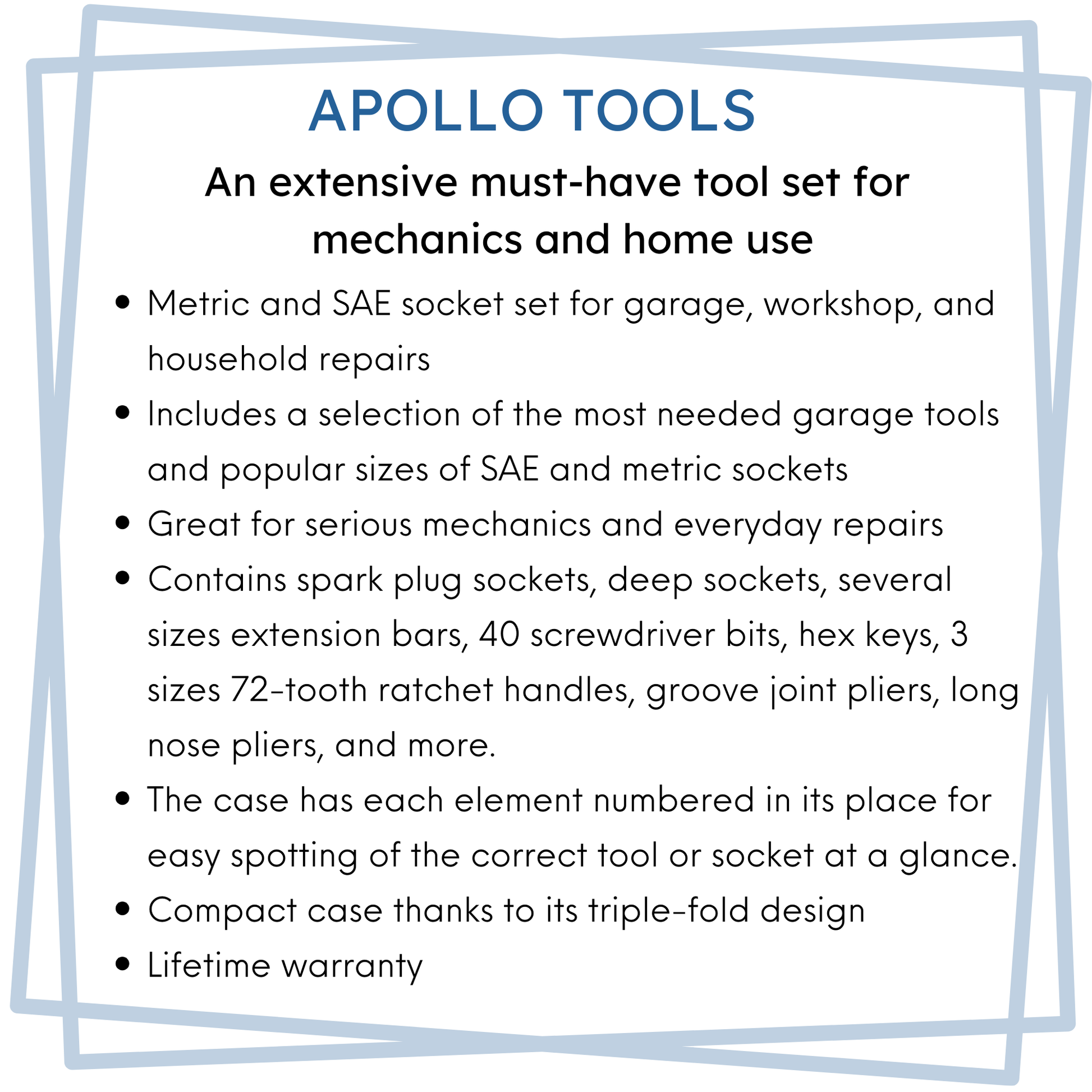 APOLLO TOOLS LIFETIME WARRANTY. The comfortable handles have double dipped plastic coating for grip and durability. All tools included meet or exceed ANSI critical standards. Our hand tools are drop forged for strength, chrome-plated to resist corrosion, have non-slip comfort grip handles for extra torque, and will last a lifetime under normal use. Click on this link to register your Apollo Tools product.